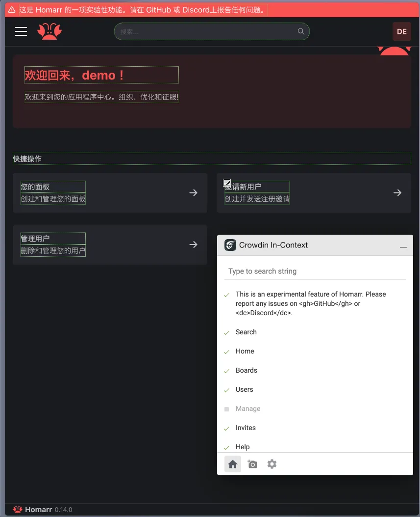Since v0.14.0, you can now help translate homarr directly from the app ! To do so simply to go your user settings and select "Crowdin (live translations)" as the language.