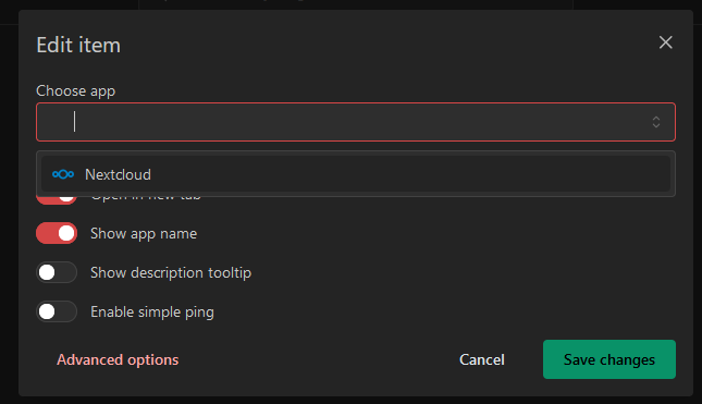 Next, click on the New app button. You'll need to provide a name and an icon to create an app. The name must be at least one character long but you can provide any image URL for the icon. Homarr ships with over 11K icons - so you can just search by entering a search text instead.